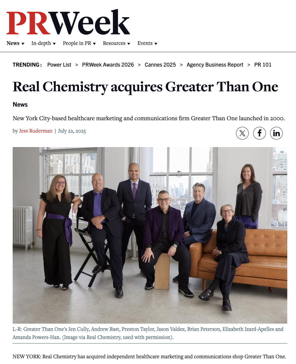 In July 2025, Real Chemistry acquired Greater Than One, a healthcare-first media and technology agency I had the privilege of helping lead through one of its most pivotal transformations. As COO, I spent the last two years redefining the agency’s structure, optimizing operations, and aligning our talent, tools, and processes to scale in a way that would make us both attractive and integration-ready.